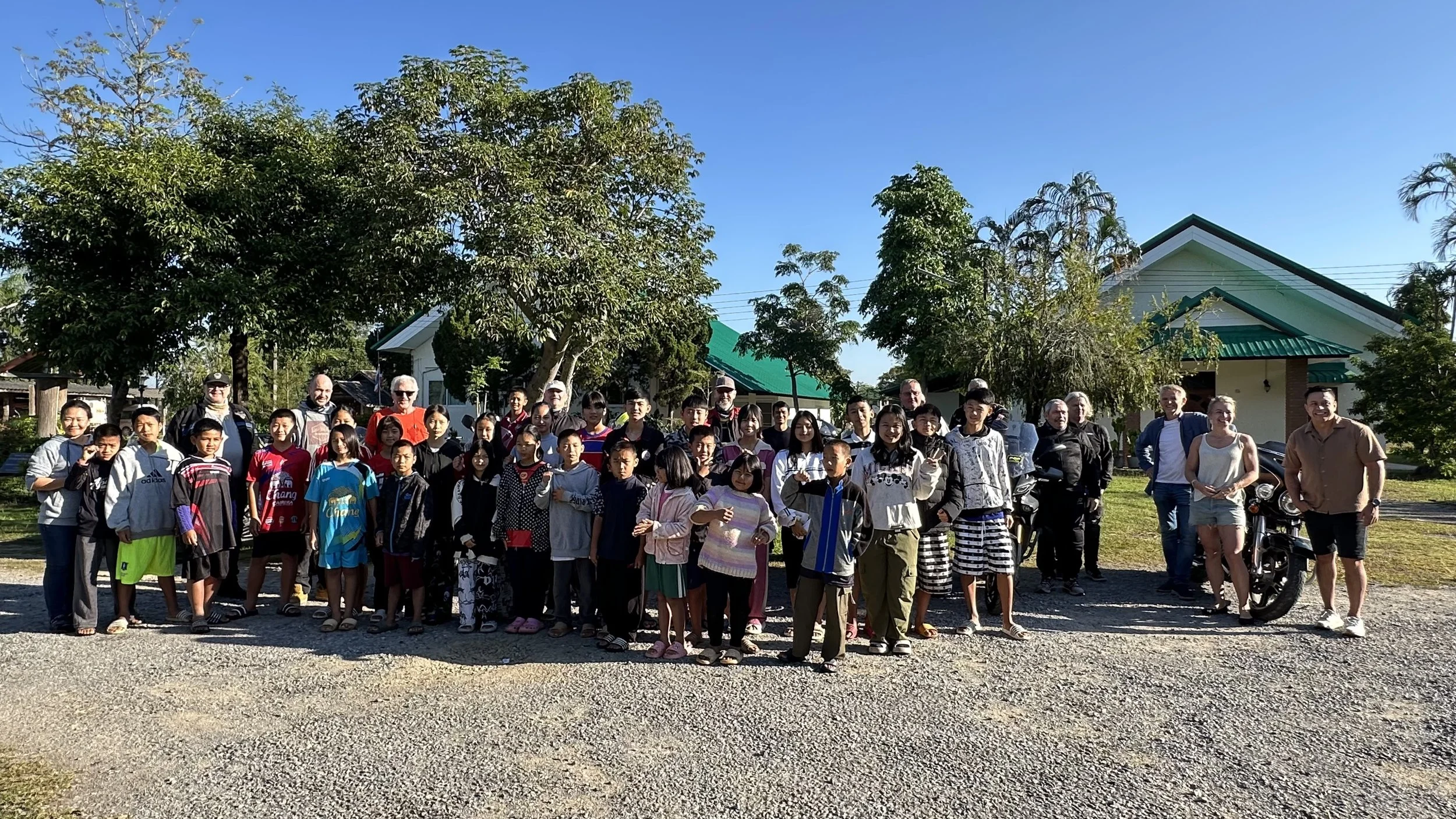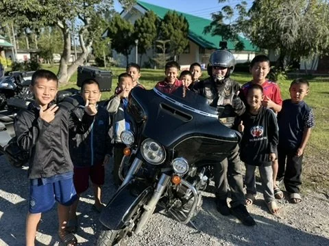 Tidlig en lørdags morgen rullet det en norsk BigBike gruppe inn på tunet vårt. Nord Thailand har fantastisk natur og innbydende veier for motorsykkelentusiaster. Ledet av en Harley Davidson, ble det mye lyd, til stor stas for ungene våre. De fikk til og med sitte litt på syklene og leke litt med gassen. Tusen takk til Helge og gruppen hans for hyggelig besøk og for en flott gave til barna. Det ble nye sengeputer til alle. Det trengtes!