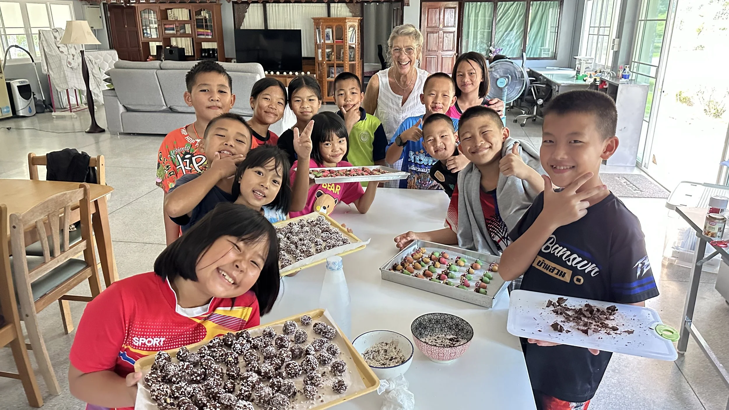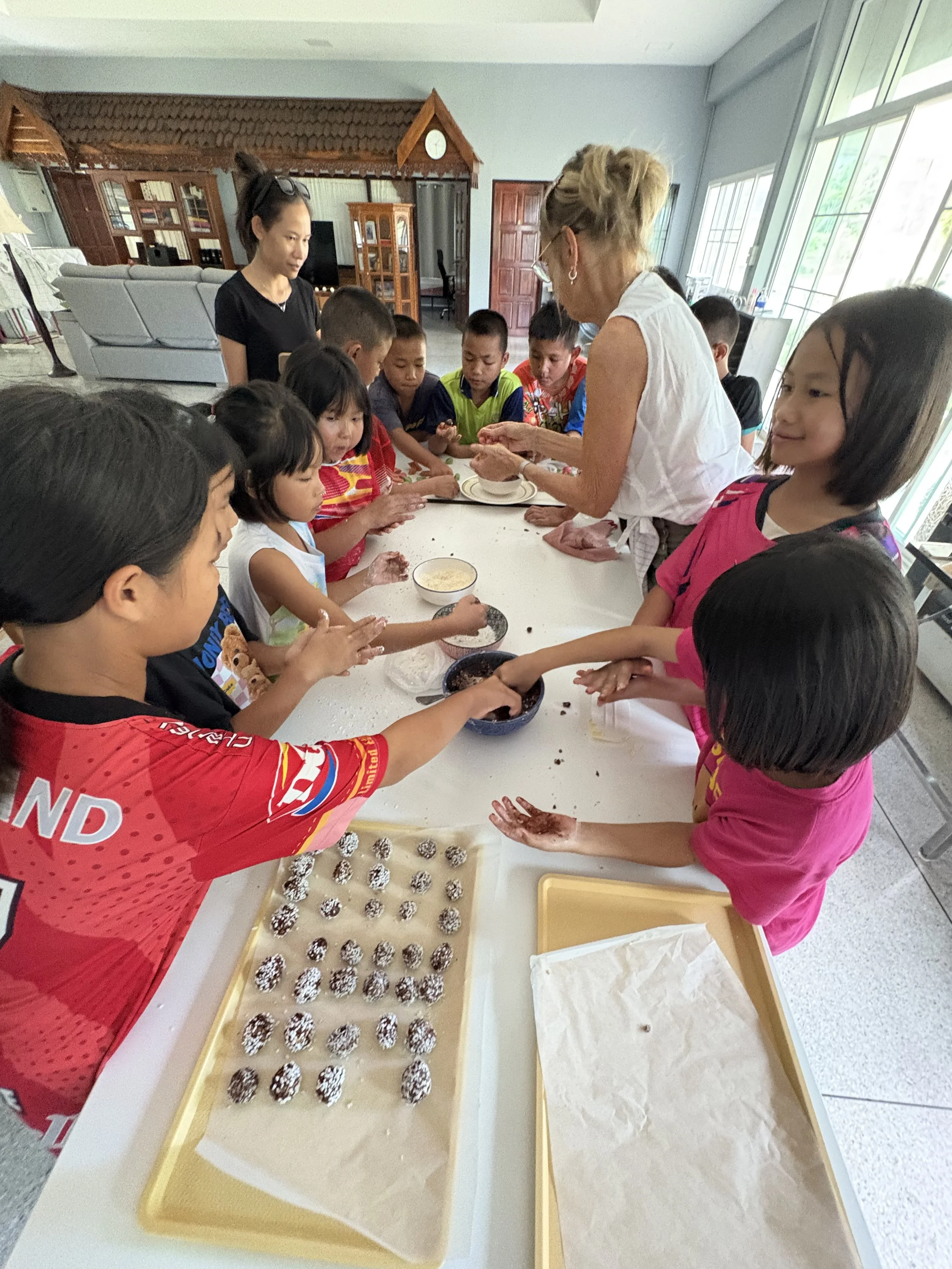 Våre svenske venner Madeleine og Inge var på besøk nå i november. En av aktivitetene de hadde var å ha bakedag med barna. Det ble sjokoladeboller, marsipangodteri og “kjærlighetsmums”. Det var veldig populært, spesielt da de fikk smaksprøver under lørdagskosen. Det meste ble likevel spart til julefesten.
