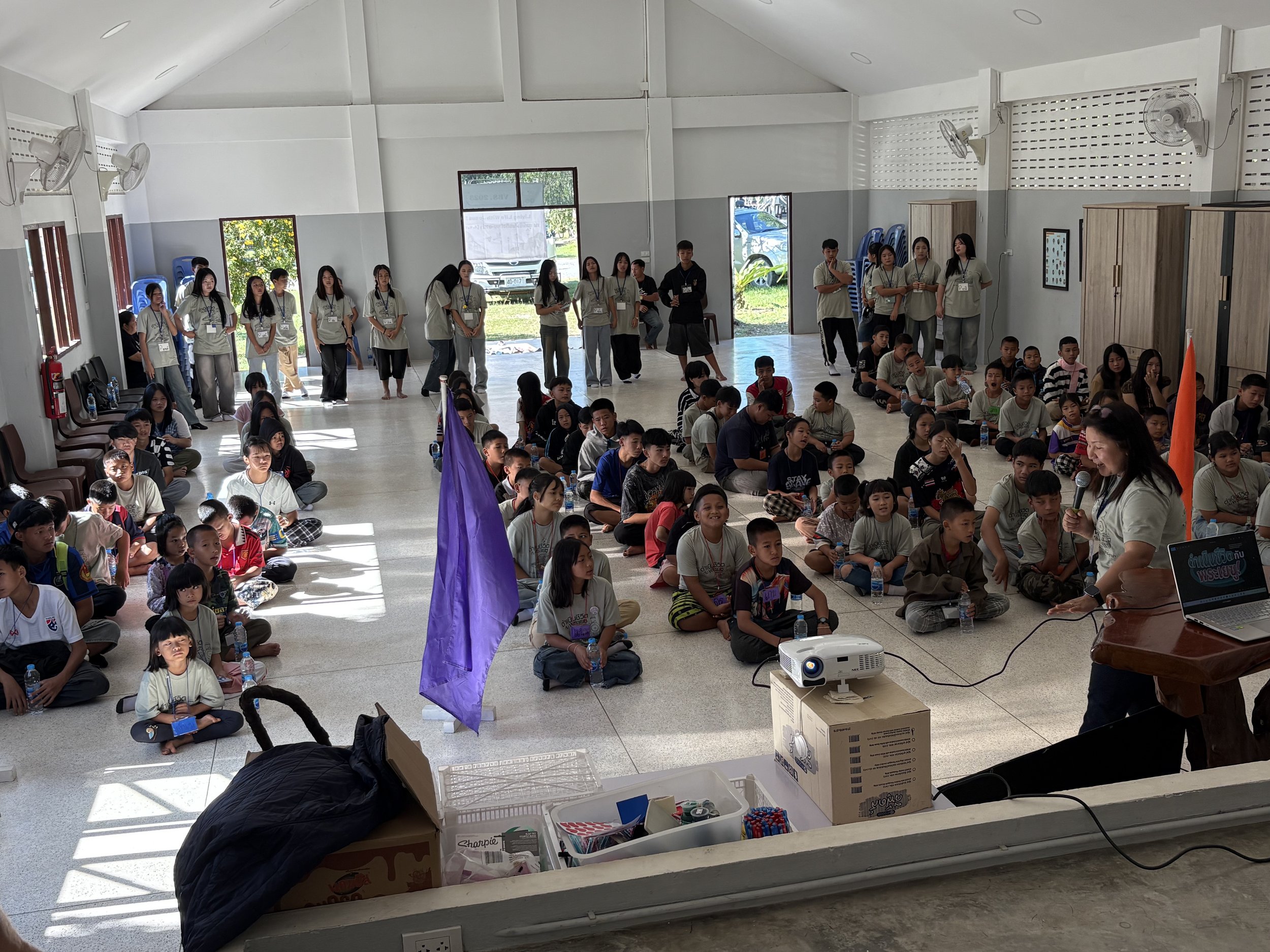 Søndag 14. november hadde vi leirdag på BCM. Vi inviterte et annet Skolehjem fra Chiangrai hjem til oss og på morgenen kjørte tre biler inn på gårdsplassen med til sammen 70 barn. Det krydde av engasjerte barn over alt. Noen av barna kom fra de samme landsbyene som noen av våre barn, så det ble spennende for dem å møtes hos oss for å se hvordan vi hadde det. Lederne fra den andre organisasjonen hadde planlagt programmet, som startet med samling i forsamlingssalen for de 110 barna og ungdommene. De sang og danset sammen, lederne underviste, og det var gruppekonkurranser. Store mengder av nudelsuppe og kokos-is var bestilt, og alt forsvant på rekordtid. En flott aktivitetsdag som frister til gjentagelse.